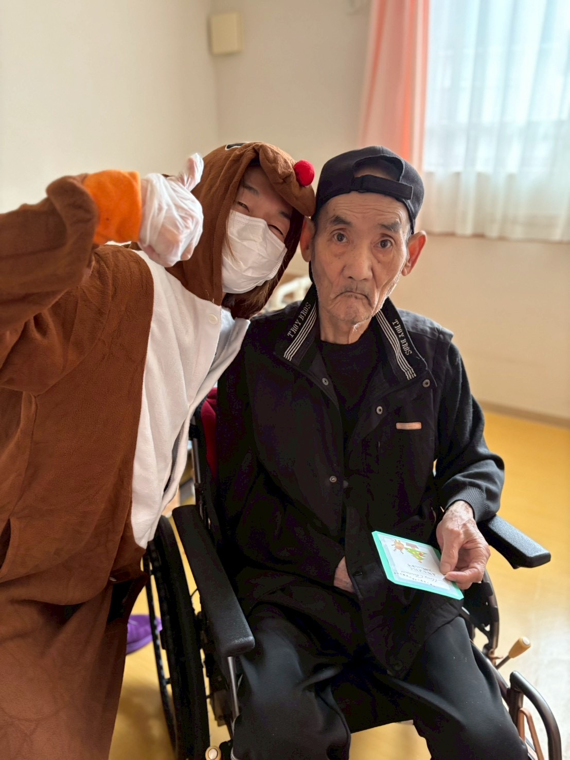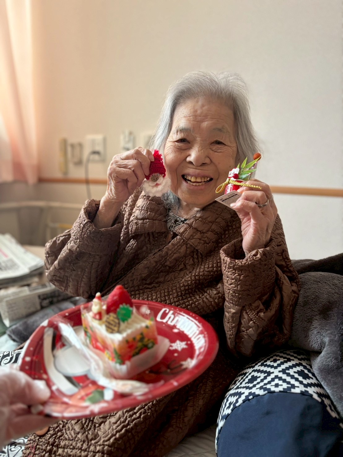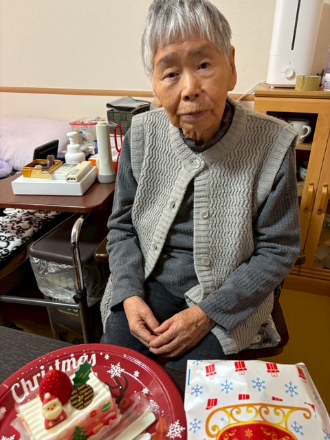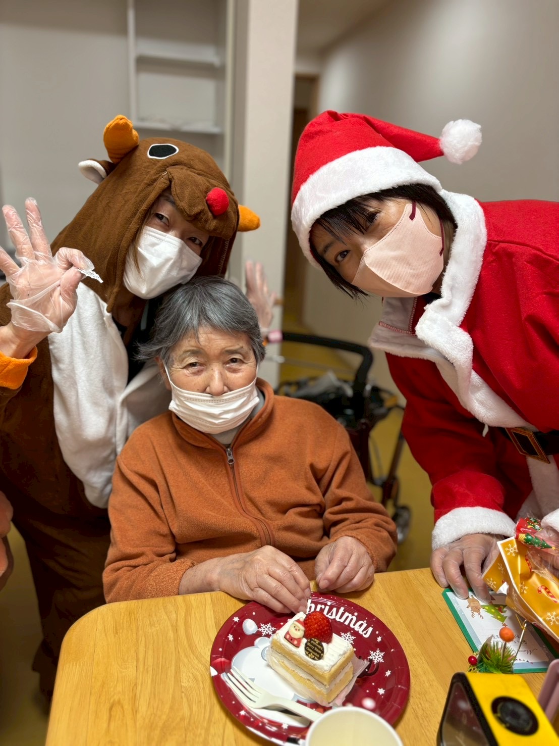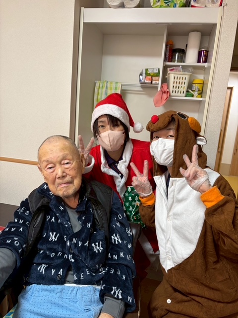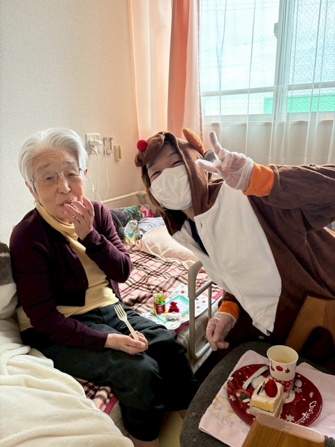 クリスマスイヴの日、職員がサンタクロースとトナカイの装いで、各居室へケーキとプレゼントをお届けしました。
