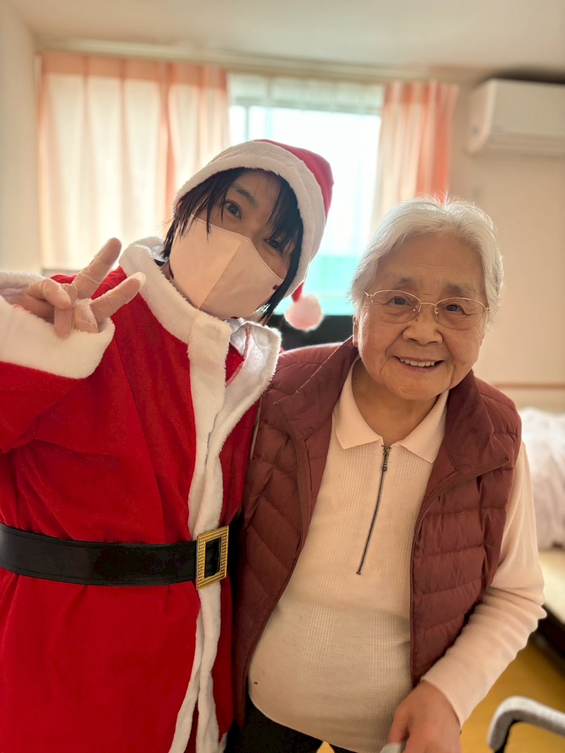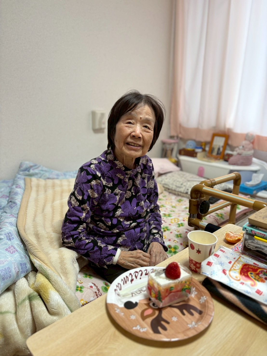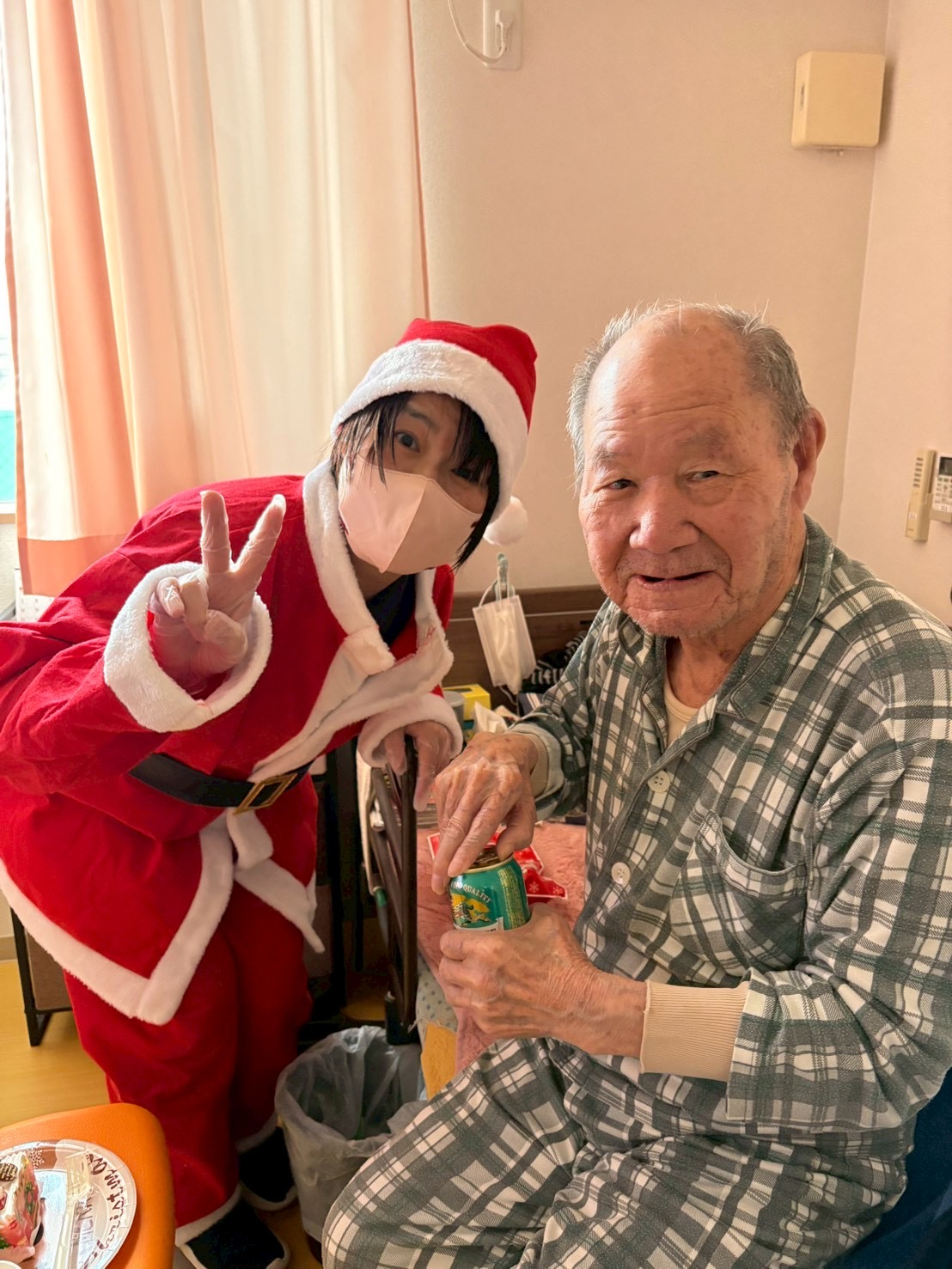 クリスマスイヴの日、職員がサンタクロースとトナカイの装いで、各居室へケーキとプレゼントをお届けしました。