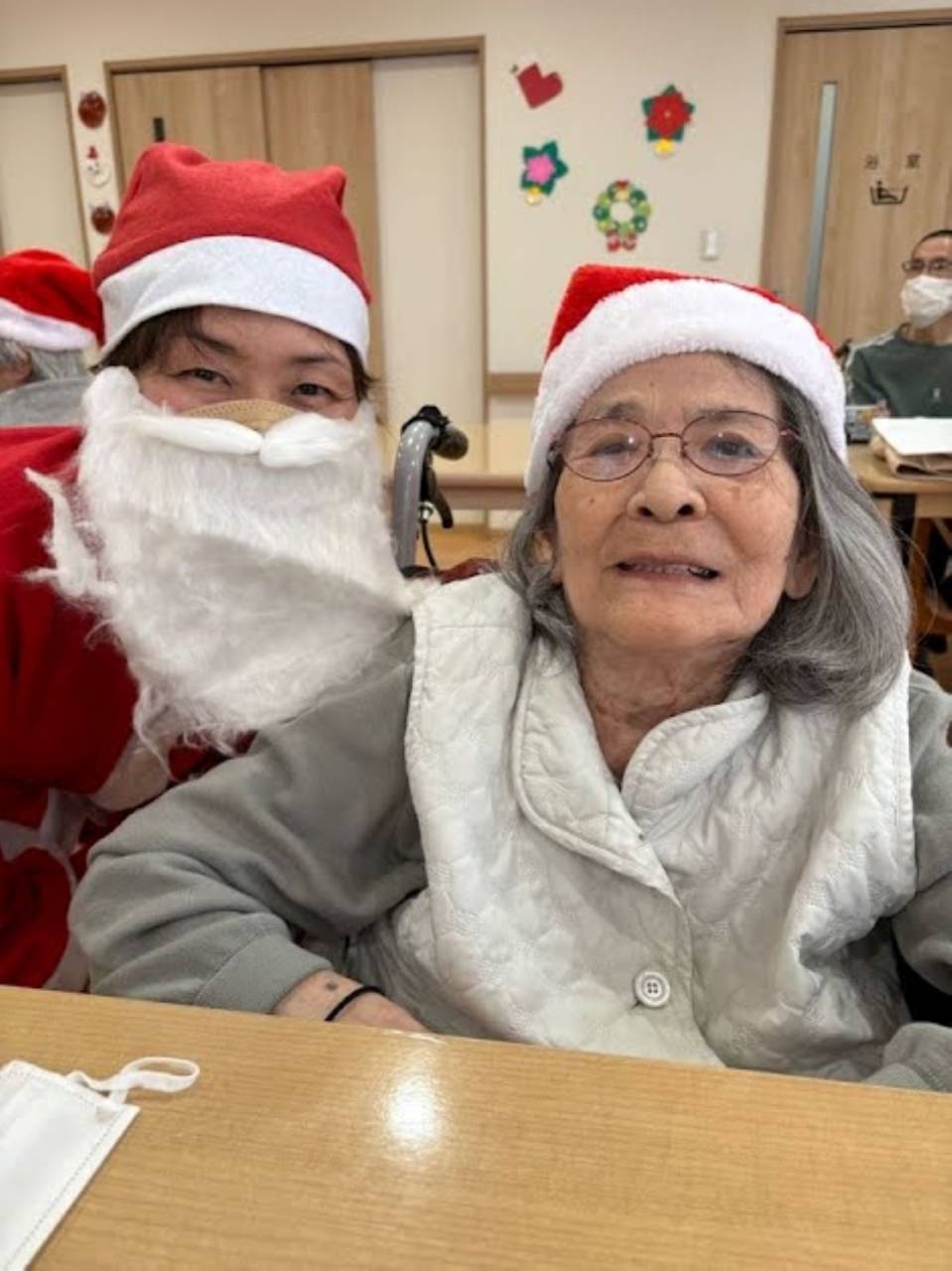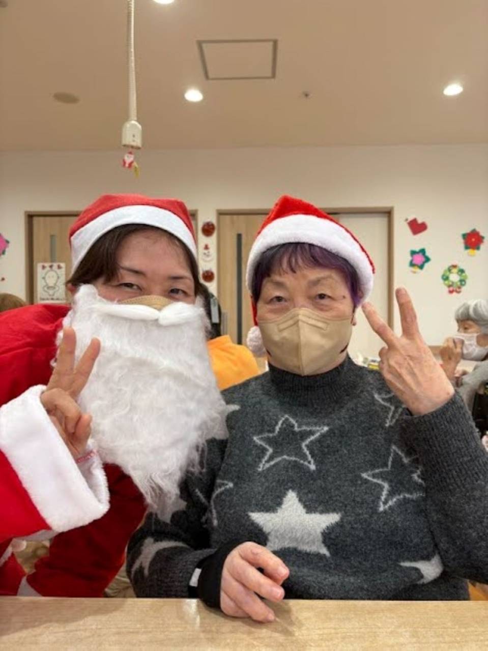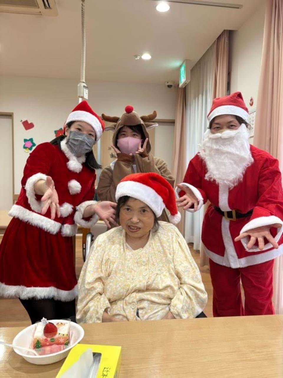 スタッフがサンタさんやトナカイさんになり!利用者の方も被り物をかぶって下さいました!