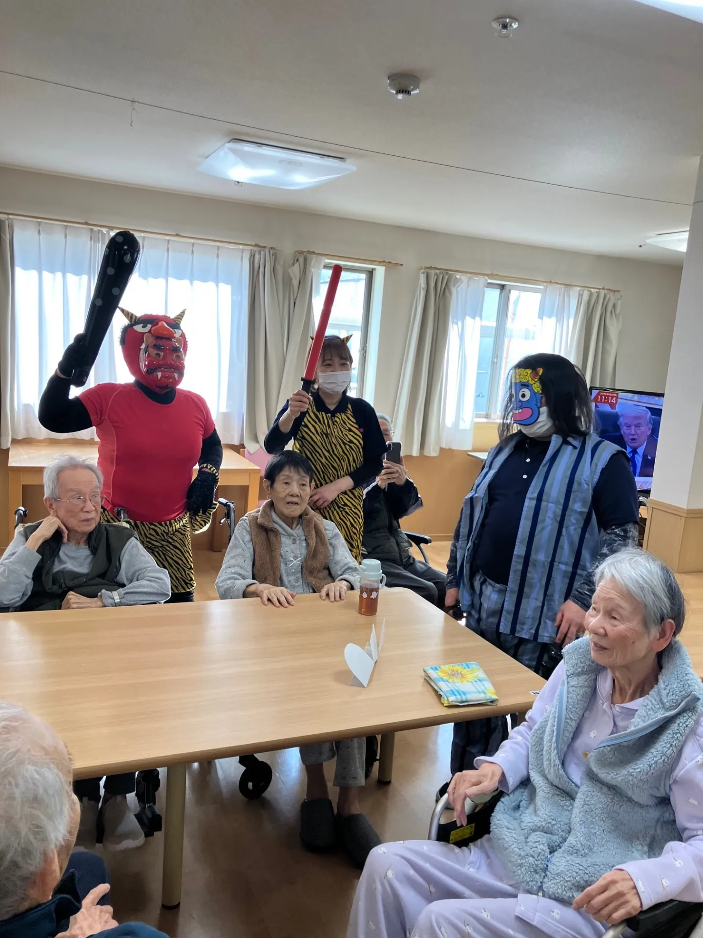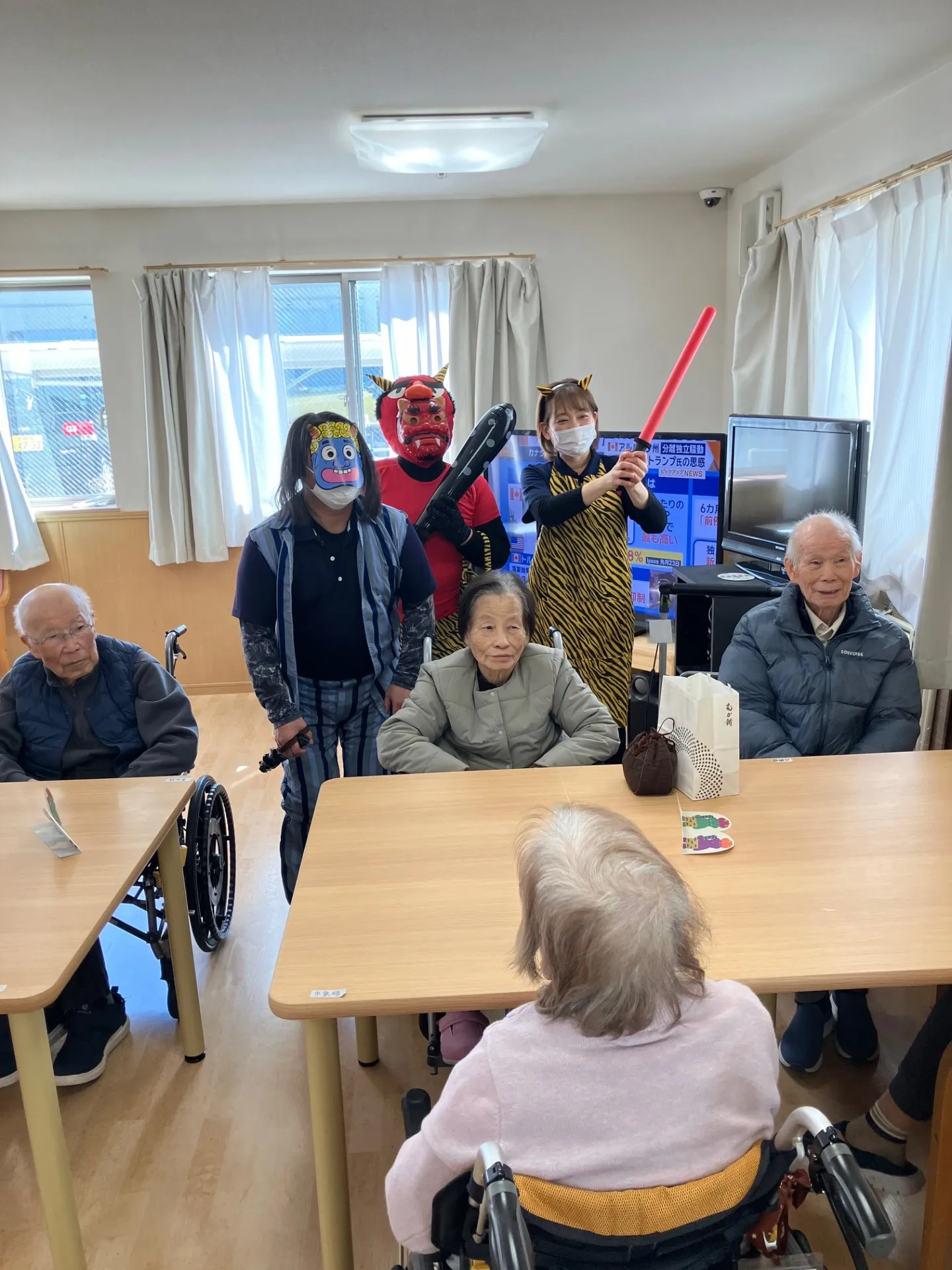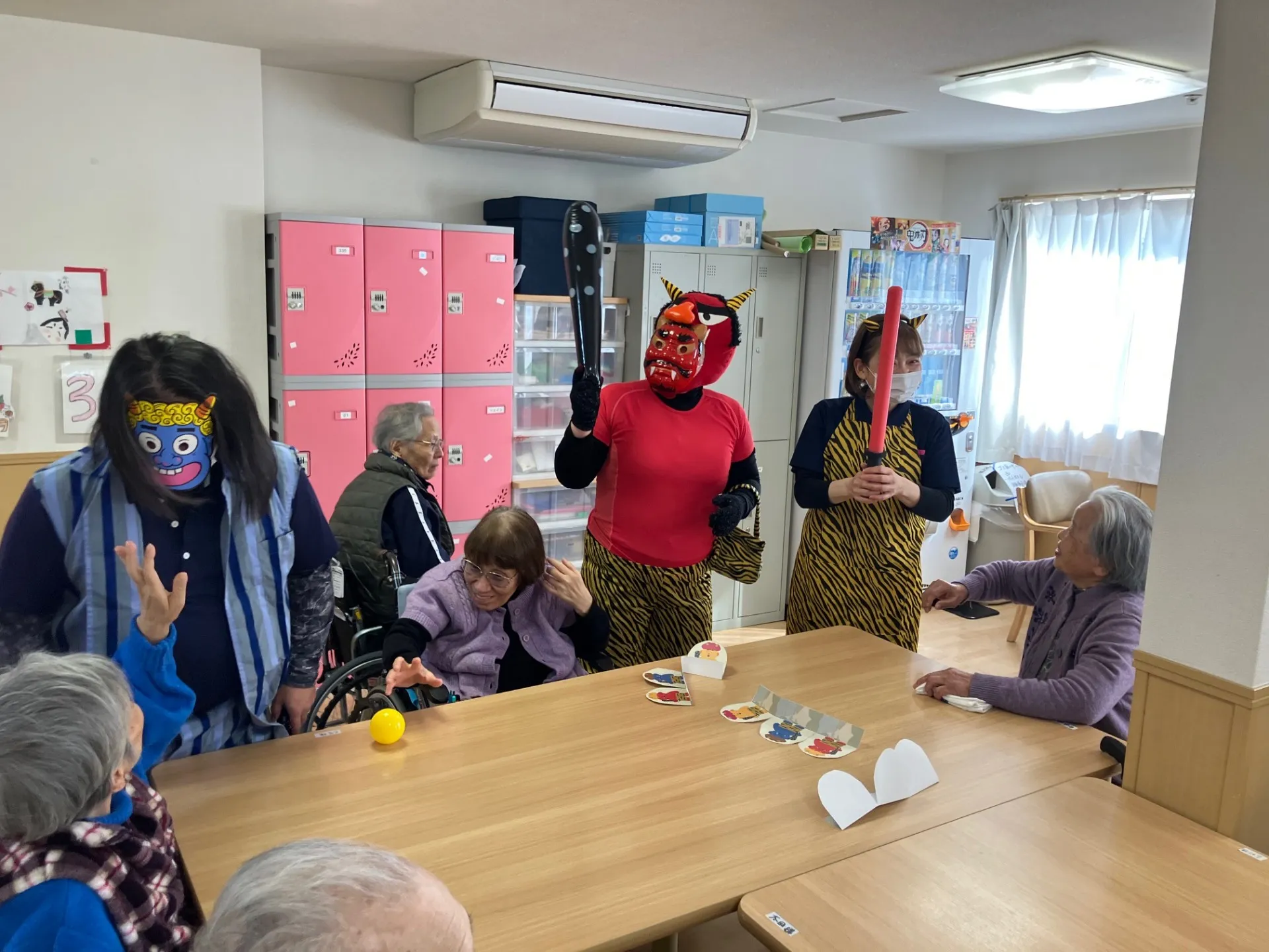 ココラ日根野の鬼たちが元気な利用者様達に豆に見立てたボールを元気いっぱい投げられて退散していきました。