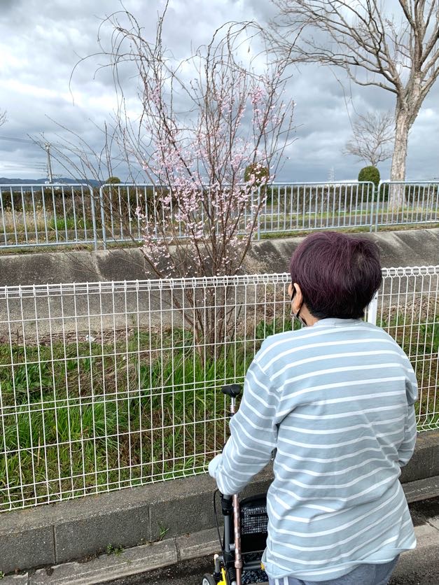 利用者様が窓の外を眺めていると小さな桜が咲いているのに気付かれ、見に行きたいと言って下さりご一緒させて頂きました✨この時は曇りの日で、前日の雨により花が少し元気がありませんでしたが綺麗に咲いていました🌸